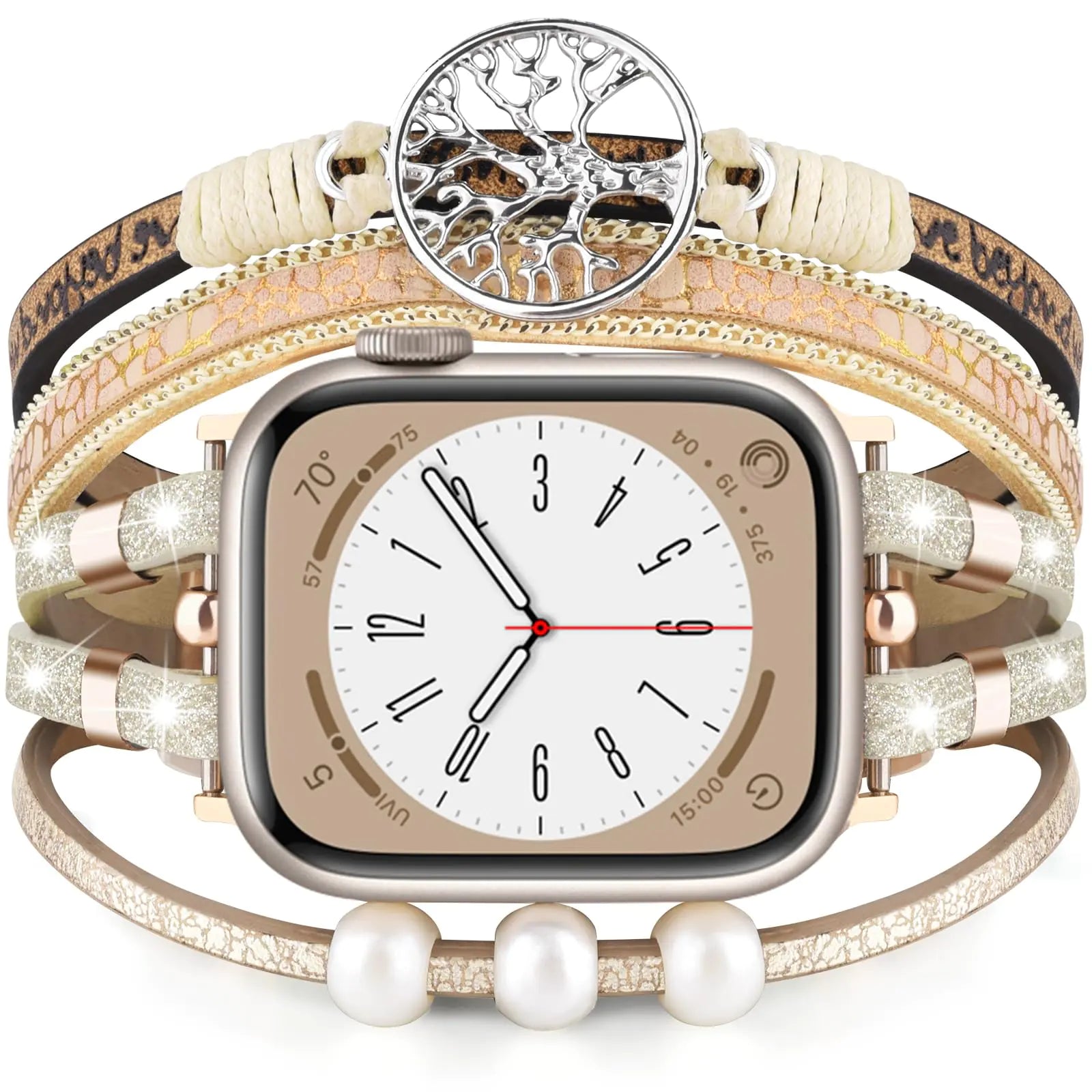 [Inspirational Apple Watch Bands 40mm Women: "Live Every Moment Laugh Every Day Love Beyond Words" which Radom appears bling iwatch bands 38mm, the glitter leather iPhone watch bands with the tree of life accessories which is a meaningful gift for lover children parent friends or others on a special day like Weddings Birthdays Valentine\s Day Mothers\ Day Christmas Thanksgiving Day anniversaries etc. Unique IWatch Bands 40mm Women: The Apple iPhone watch bands are made of high-quality material( skin-friendly bling leather zinc-alloy clasps and stainless steel tree) comfortable to wear stylish for trends long-term for use meaningful for lovers all-matching for work date dance party etc. For All Apple Watch 38mm/40mm/41mm Models: The Shiny bracelet Apple watch band beaded replacement with Apple Series 9/Series 8/Series 7/Series SE/Series 6/Series 5/Series 4/Series 3/Series 2/Series 1 41mm/40mm/38mm watch bands for Sport Hermes Nike+ Edition all Apple Watch models. Fit 5.4~7.5 Wrist Female: The Beaded Apple watch bracelet 41mm Bands which is designed with 3 adjustable bling clasps easily adjusts from 5.4 inches to 7.5 inches with no tools. Easy-Installing Apple iPhone Watch Bands: The Multilayer Wrap Straps Bands for Apple watches with watch lugs on both ends which lock onto all Apple watch models precisely and securely any questions please feel free to click "Contact Seller" and our customer service team will help you at any time]